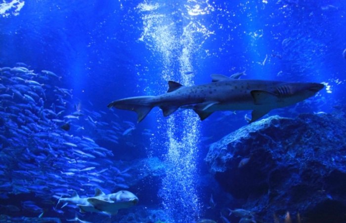 • 除了鮪魚,你還能看到巨大的 🦈 灰鮫鯊(Sandbar Shark)、優雅的 🐟 鰹魚、靈活的 🐟 鰺魚 等,共同構成這幅壯闊的「大洋魚群圖」。陽光從水槽頂部自然灑落,光線在水中折射,魚群閃閃發光,那個畫面太夢幻!