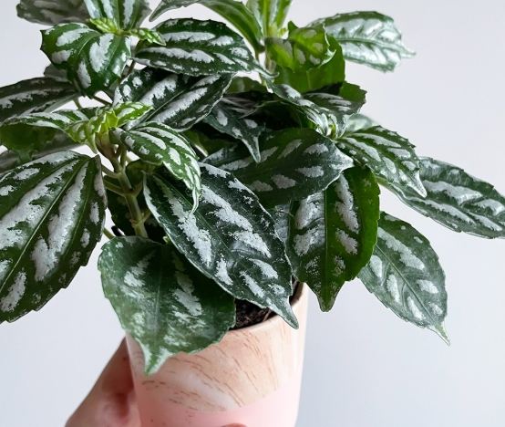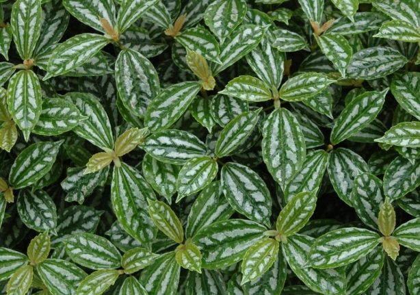 • 銀脈冷水花 (Pilea cadierei): 顧名思義,它的深綠葉片上佈滿了規則的銀白色斑紋,看起來非常優雅俐落,有點像藝術家精心繪製的。這種條紋感讓它在簡約風格的空間裡特別出彩。