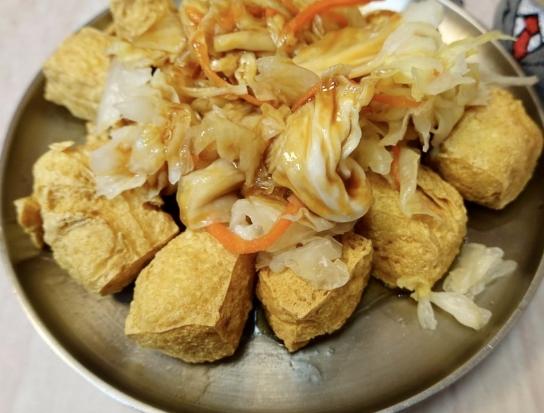 這家「裡長伯」的臭豆腐,在寧夏夜市是數一數二的老字號,臭豆腐愛好者絕對不能錯過!他們的豆腐發酵程度抓得剛剛好,屬於「香氣足但不會臭到嚇跑路人」的那種。最大特色就是「現點現炸」。看著油鍋裡金黃的豆腐翻滾膨脹,就能想像待會入口的酥脆感。 老闆娘手腳超俐落,豆腐一出鍋立刻剪開,淋上蒜泥醬油,配上自製的酸甜臺式泡菜。 夾一塊熱騰騰、外皮酥得像餅乾的臭豆腐,中間卻保持著軟嫩多汁的孔隙,蘸點醬汁,再配上一口爽脆泡菜... 那種冷熱交融、酥軟兼具、鹹香與酸甜碰撞的口感,真的會讓人上癮!每次去寧夏,這攤的臭豆腐香總是勾著我,就算吃飽了也要來一份當點心。